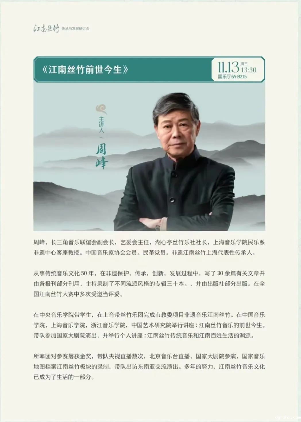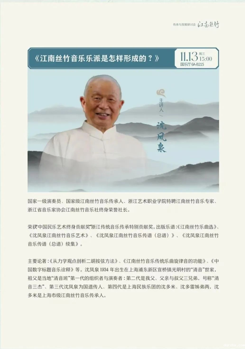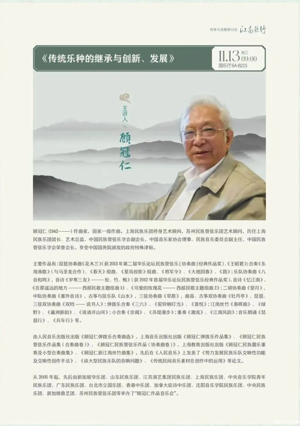 研讨会将邀请非物质文化遗产江南丝竹国家级传承人沈凤泉、著名作曲家顾冠仁、江南丝竹专家孙文妍、周峰、成海华等音乐理论与演奏家们,围绕“江南丝竹的传承与发展”,立足原汁原味继承中国传统音乐,提炼江南丝竹音乐特征,汲取音乐养分,为创作具有江南丝竹音乐特征的作品提供理论依据,以守正创新为原则,从继承、发展及创作等方面展开研讨。