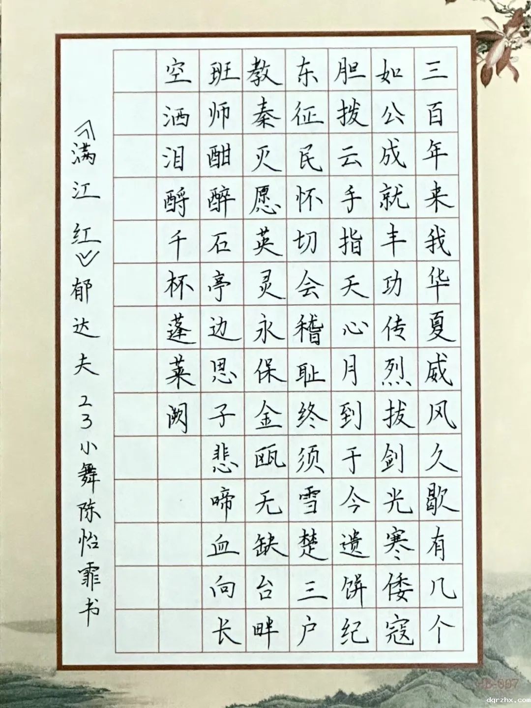 笔墨本无心,但书者复制,但见白纸上尽显风骨,一首《水调歌头》仿佛看到在那场二万五千里长征革命战士彭雪枫对胜利的信心和坚定的信念;二记郁达夫《满江红》当写下“团结无间凝E力,同仇敌忾敌才赢”,看到作者的气魄与团结的精神;三留《沁园春》杨靖宇,融情于景。当书写出这首诗的时刻,仿佛与作者共情,那种视死如归的精神一直同我们相连。